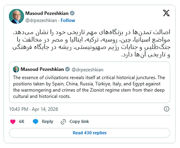 围绕中东局势持续紧张,伊朗总统马苏德·佩泽希齐扬日前在社交平台发声,点名肯定多个国家在当前局势中所展现的反战态度。他认为,在关键历史时刻,各国立场往往反映出其文明底蕴与长期积淀。