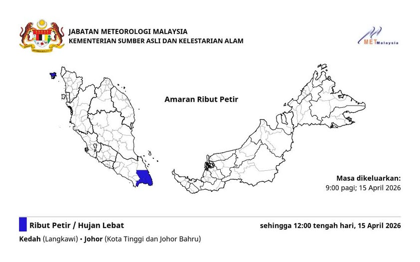 气象局针对大马多地发布最新雷雨警报,预计北马浮罗交怡以及南马柔佛部分地区将迎来狂风暴雨,恶劣天气料持续至今日中午12时。