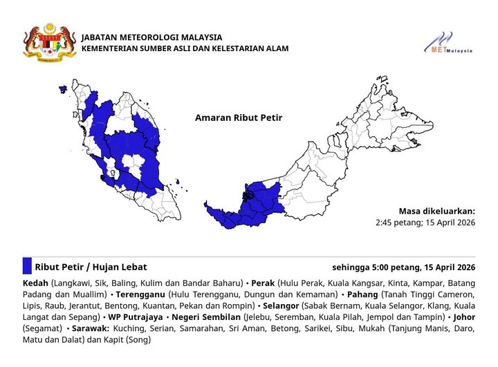 大马气象局针对全国多地发出气象预警,西马半岛多个州属及砂拉越局部地区预计在今日遭遇剧烈天气变化,受影响地区的雷雨、大雨及强风天气将持续至下午5时。