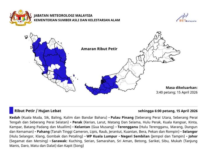 马来西亚气象局(MET Malaysia)于今日(2026年4月15日)下午3时40分发出紧急警报,预告一场大规模的雷雨天气正横扫大马半岛及东马多个省份。由于局部地区降雨量预计每小时超过20毫米,加上伴随而来的强风,气象局提醒受影响地区的民众,恶劣天气将持续至今日傍晚6时。