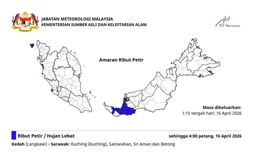 根据气象局资料,这项警报于4月16日下午1时15分发出,涉及地区包括吉打的浮罗交怡,以及砂拉越的古晋、省会区三马拉汉、斯里阿曼和木中。