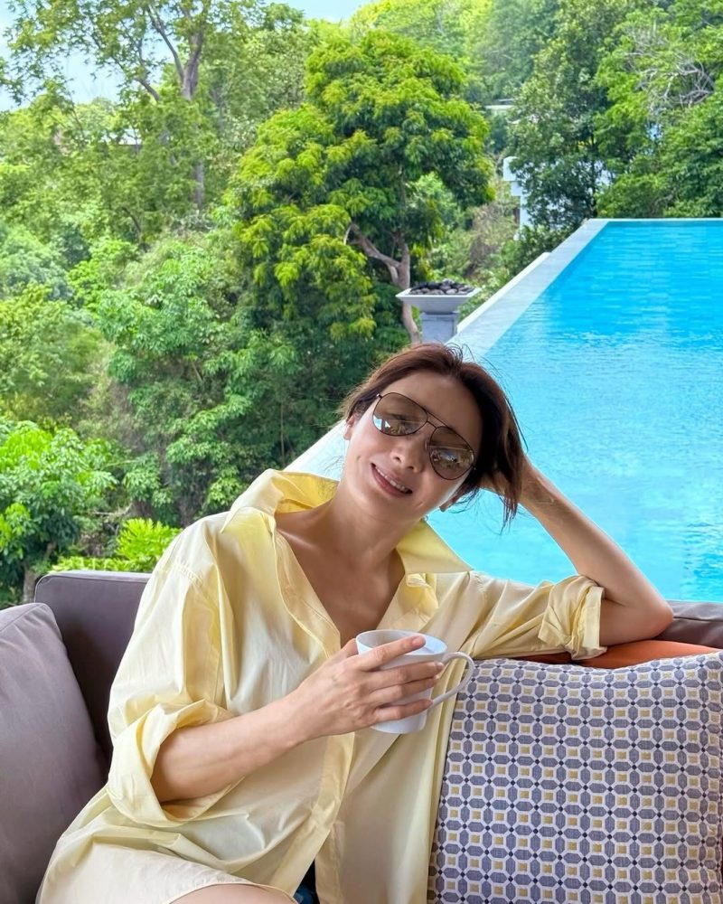 此外,她也晒出多张度假日常,包括坐在泳池旁享受咖啡时光,以及悠闲享用早餐的画面,整体氛围轻松惬意,尽显生活品味。