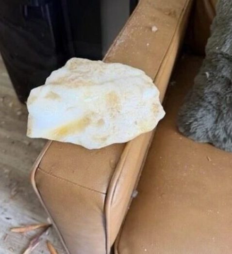 这起离奇事件发生在4月10日上午约11时15分。屋主当时先听见一声近似爆炸的巨响,随后发现屋顶已被击穿,屋内天花板严重受损,一大块表面带有污渍的冰块则掉落在客厅内。