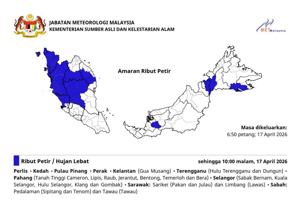 大马气象局今晚发出雷雨警报,多个州属预计持续出现雷暴及豪雨天气,警报有效至今晚10时。