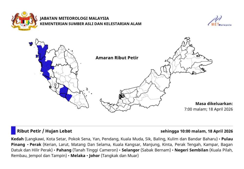 根据通报,受影响地区包括吉打州(浮罗交怡、哥打士打、波各先那、铅、本同、瓜拉姆拉、锡、华玲、居林、万拉峇鲁)、槟城、霹雳(吉辇、拉律马当司南马、江沙、曼绒、近打、中霹雳、金宝、峇眼拿督、下霹雳),以及彭亨金马仑高原、雪兰莪沙白安南、森美兰(瓜拉庇劳、林茂、仁保、淡边)、马六甲及柔佛(东甲与麻坡)。
