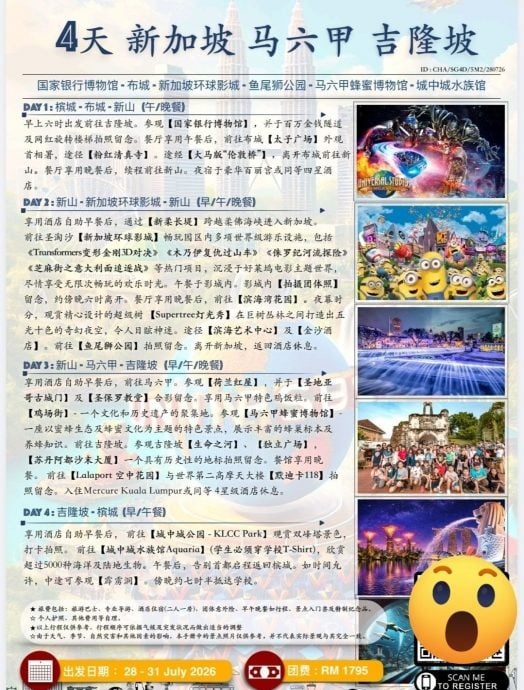 她指出,孩子学校为六年级毕业生安排的行程为4天3夜,目的地涵盖新加坡、马六甲及吉隆坡,整体配套费用高达1795令吉,接近1800令吉,让她感到相当惊讶。