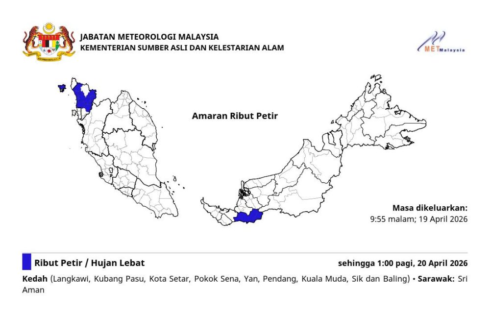受影响地区包括吉打州的 浮罗交怡、古邦巴素、哥打士打、波各先那、铅县、本同、瓜拉姆拉、锡县及华玲;砂拉越方面则涉及斯里阿曼一带。预计恶劣天气将持续至星期一(4月20日)凌晨1时。