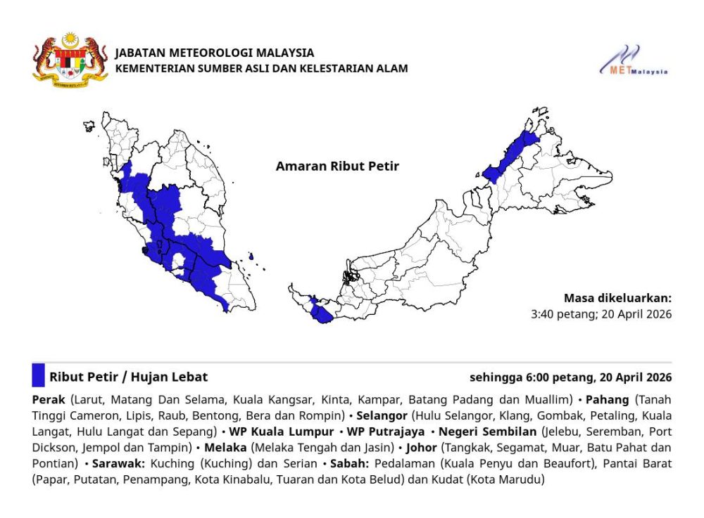 大马气象局(MetMalaysia)于今日(2026年4月20日)下午3时40分紧急发布红色雷雨警报。根据卫星云图显示,强烈的对流天气正横扫大马半岛及东马多州,预计强降雨、狂风及雷暴将持续至今日傍晚6时。