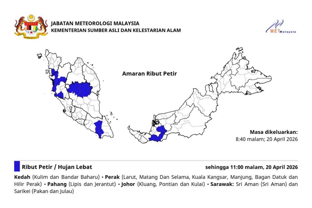 马来西亚气象局发布最新雷暴天气警报,指出多个州属将出现雷雨、暴雨及强风天气,预计持续至今晚11时(2026年4月20日)。