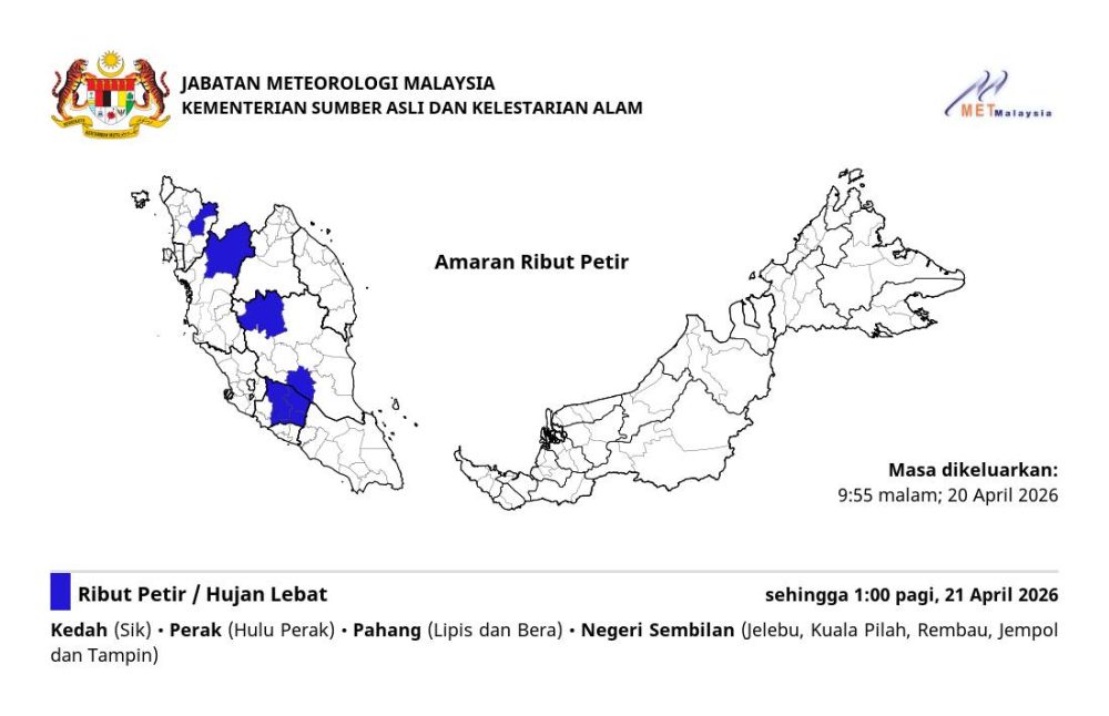 马来西亚气象局(METMalaysia)于今晚9时55分发布最新气象预警,预料国内数个州属的局部地区将迎来持续雷雨、强降雨及阵风,恶劣天气预计将横跨午夜,一直持续至明日(4月21日,周二)凌晨1时。