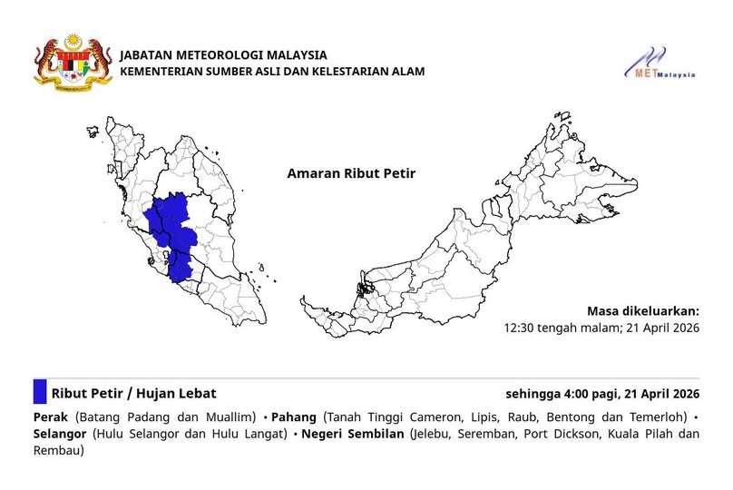 马来西亚气象局(METMalaysia)在今日(4月21日,周二)凌晨12时30分发布最新紧急警报,预料国内多个州属将迎来强烈的雷雨及阵风,这场午夜暴雨预计将持续至今晨4时。