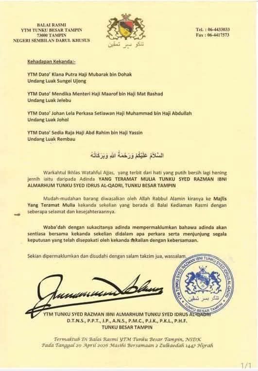 与此同时,四大酋长与东姑赛拉兹曼也发布联合声明,就森州最高统治者相关课题表达立场,并对州务大臣的言论提出质疑,同时建议进行相关调整与检视。