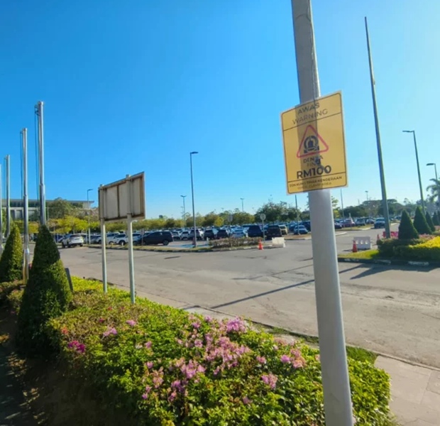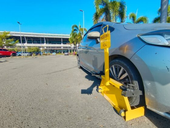 亚庇国际机场付费停车场近日加强执法,对未停在指定车格内的车辆采取“锁轮”措施,并须缴付100令吉罚款后方可解锁,引发广泛关注与讨论。