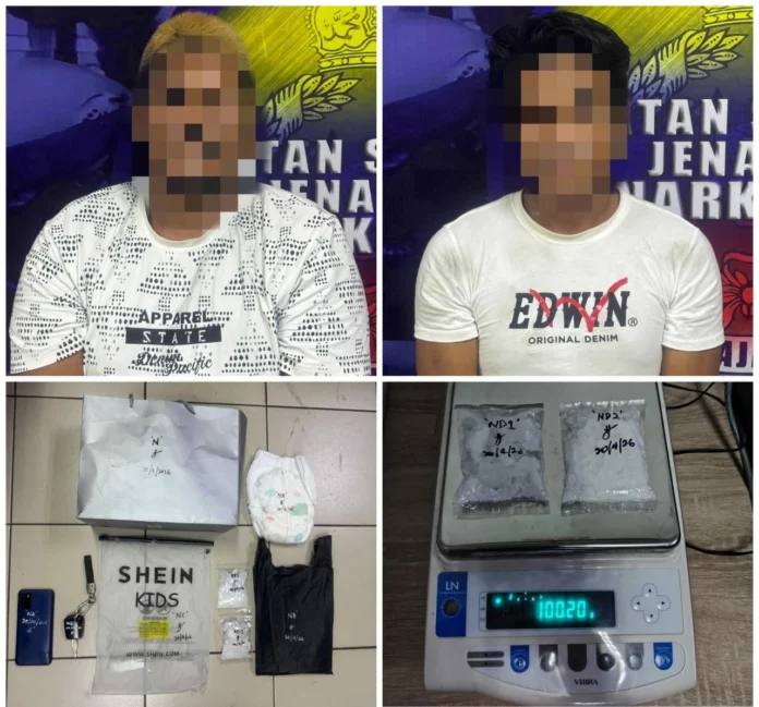 进一步搜查车内时,执法人员在纸袋内发现藏有两大包透明塑料袋,内装疑似冰毒的物品,总重量约100.20克,估计市值约1000令吉。有关毒品更被刻意藏在Huggies品牌一次性尿布中,企图掩人耳目。