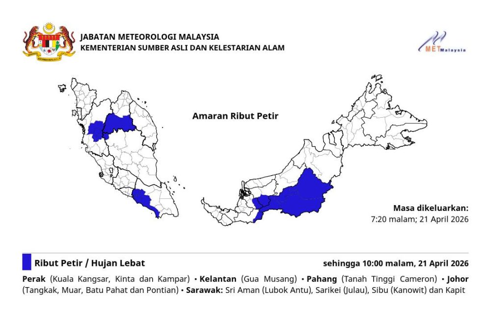 大马气象局于2026年4月21日晚间7时20分发布紧急雷雨预警,提醒多个州属的居民严防闪电水灾及强风威胁。根据最新气象报告,受影响地区的雷雨、暴雨及强风天气预计将持续至今晚10时,民众受促在出行或户外活动时提高警惕。