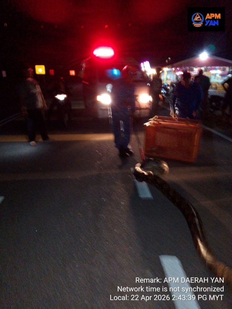 吉打峨仑凌晨发生蛇只闯路事件,一条体型庞大的蟒蛇横卧在马路中央,导致车辆通行受阻。所幸民防部队接获投报后赶往现场处理,成功将蟒蛇移离路面,过程中没有传出人命或伤亡事故。