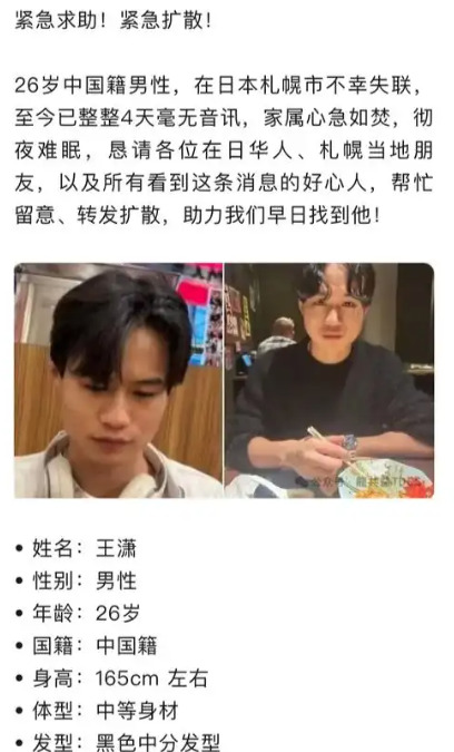 据了解,王潇失联后,女友于翌日第一时间向日本警方报案,并同时联系中国驻札幌总领事馆寻求协助。家属随后也透过不同渠道继续追查下落,包括向领事馆提交资料,以及联系当地华人社群,希望扩大寻人范围。