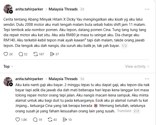 一段跨族群互助的往事近日再度引起关注。一名巫裔网民在看到“路边黑油”伸手帮助华裔摩哆骑士Dicky的故事后,忆起自己多年前也曾在深夜摩哆抛锚时,获得一名华裔修车师傅无条件相助,而这段经历最终却以令人鼻酸的结局收场。
