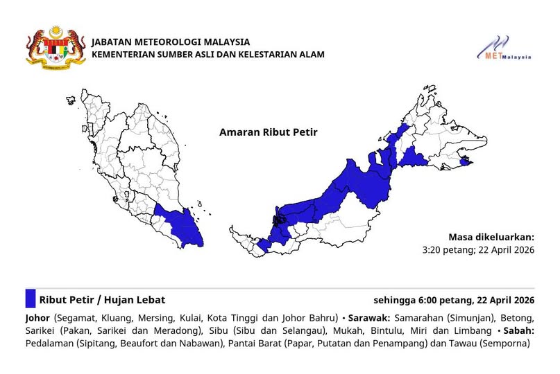 大马气象局于今日(2026年4月22日)下午3时20分发布紧急雷雨预警,提醒南马及东马多地居民注意午后强对流天气的来袭。根据气象局监测,多地正面临降雨量每小时超过20毫米的强降雨,并伴有强风与闪电,预计这波恶劣天气将至少持续到傍晚6时。