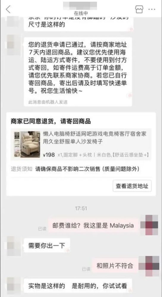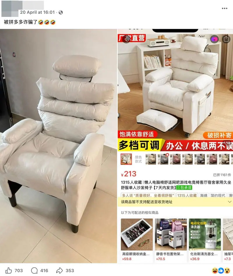 大马一名网民近日就在Facebook分享自己网购椅子的翻车经历,引起大量共鸣。他表示,自己下单前看到的商品图相当吸引人,椅子外形时尚、设计感强,看起来既舒服又有质感,摆在家里似乎能立刻提升整体空间氛围,加上售价还算落在可接受范围内,于是决定购买。