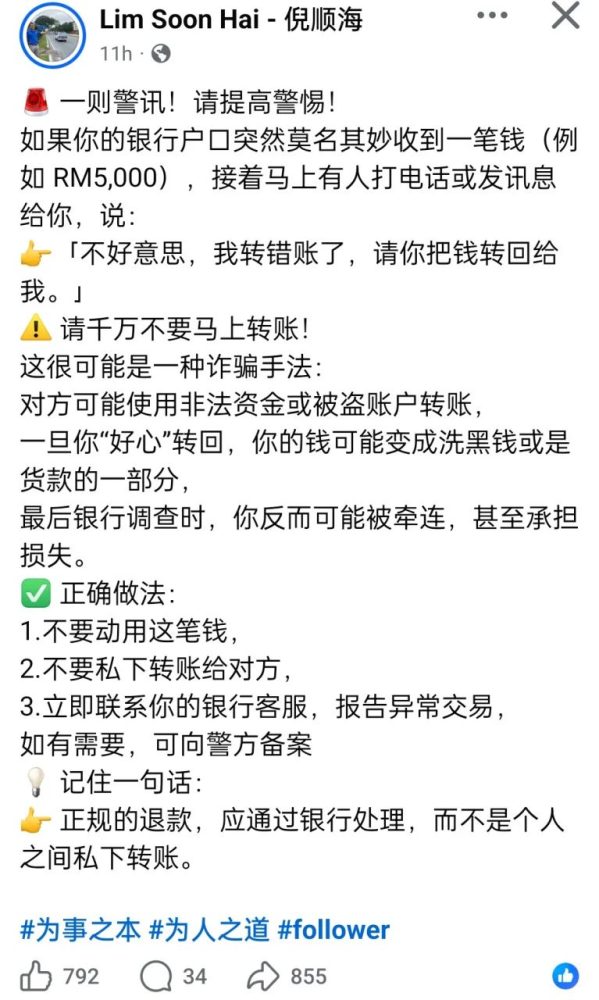 一名巫裔女网红在TikTok发布视频提醒民众,这类情况并非偶然入账,而是诈骗集团可能盗用他人资料申请贷款或进行非法操作,随后再将资金转入无辜人士的银行户头,制造“误转款项”的假象。