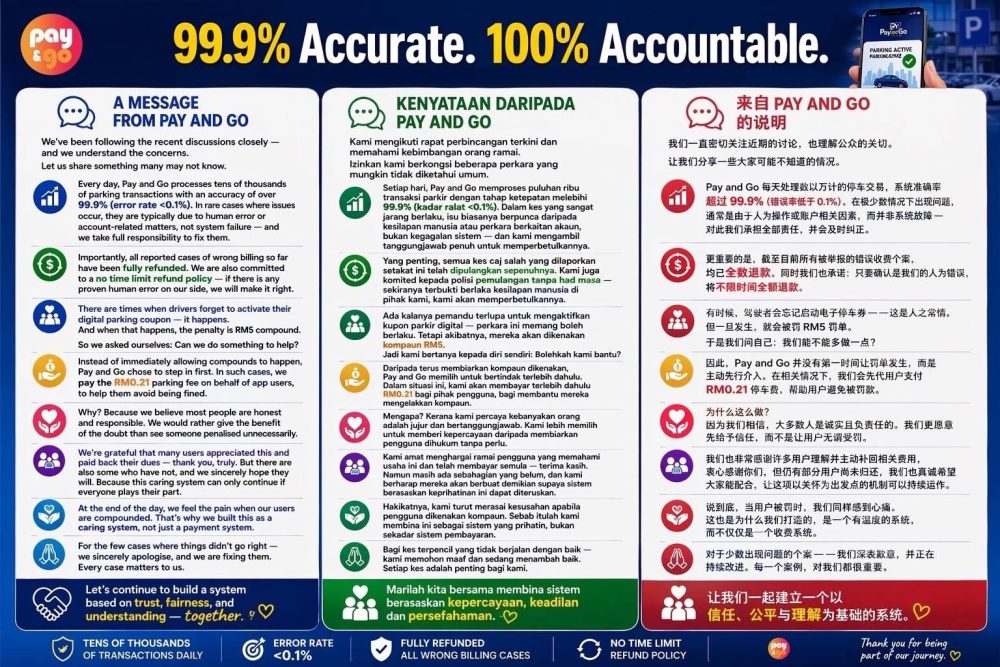 针对个别收费异常情况,Pay and Go解释,多数并非系统故障,而是源自人为操作或账户因素所致。无论原因如何,平台强调已对所有已确认的错误收费个案完成退款,并承诺只要确认属于平台责任,将不设时限为用户处理退款事宜。