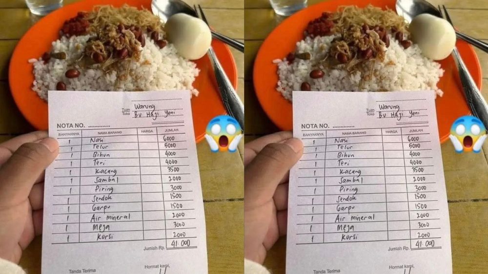 根据网上流传的收据照片,这名顾客当天在餐厅消费共4万1000印尼盾(约(9令吉))。他点了一份白饭配水煮蛋,价格为2万500印尼盾(约(5令吉)),另加一份炒米粉4,000印尼盾(约(0.92令吉))及矿泉水2,000印尼盾(约(0.46令吉))。