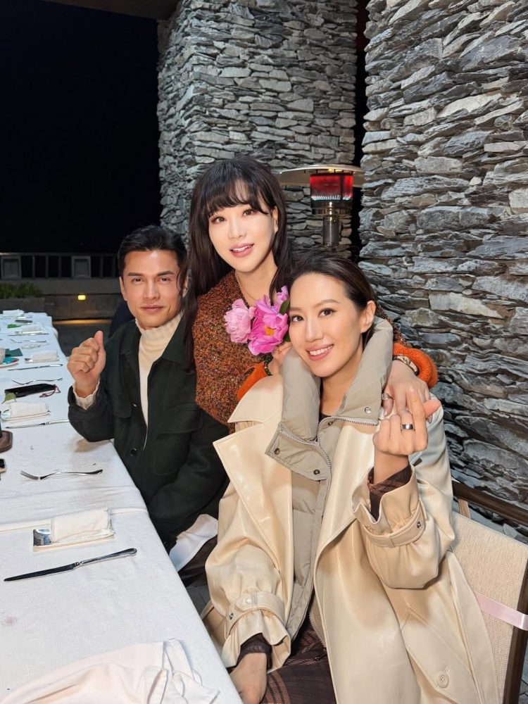 画面中,她手捧鲜花与子女合影,母亲汪徐莉君亦一同入镜,气氛轻松愉快,展现一家人的亲密关系。