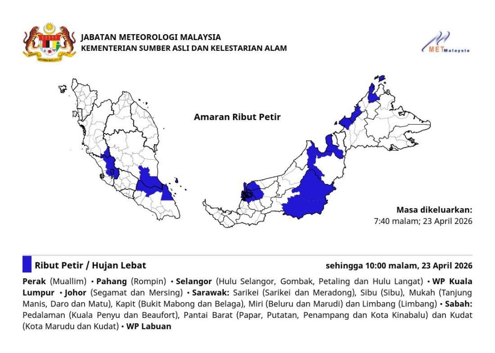 气象局发布最新雷暴预警,多地预计出现雷暴、强降雨及强风天气,影响范围涵盖霹雳(慕亚林)、彭亨(云冰)、雪兰莪(乌鲁雪兰莪、鹅唛、八打灵及乌鲁冷岳)、吉隆坡联邦直辖区、柔佛(昔加末及丰盛港),以及砂拉越与沙巴多个地区。