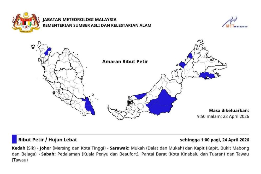 气象局发布深夜雷暴预警,多地预计将出现雷电、强降雨及强风天气,影响范围包括吉打(锡县)、柔佛(丰盛港及哥打丁宜),以及砂拉越和沙巴多个地区。