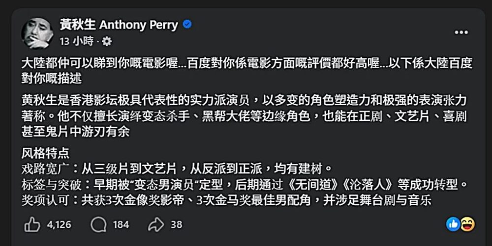 对此,他日前在社交平台发文自嘲,分享自己在百度上的资料页面,发现内容不仅完整保留,甚至对其演技评价颇高,让他直呼“看了都觉得好笑”。