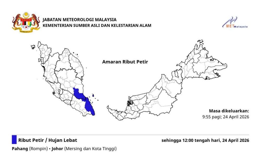 气象局发布最新天气警报,预计彭亨(云冰)及柔佛(丰盛港、哥打丁宜)将出现雷暴、强降雨及强风天气,影响预计持续至2026年4月24日中午12时。