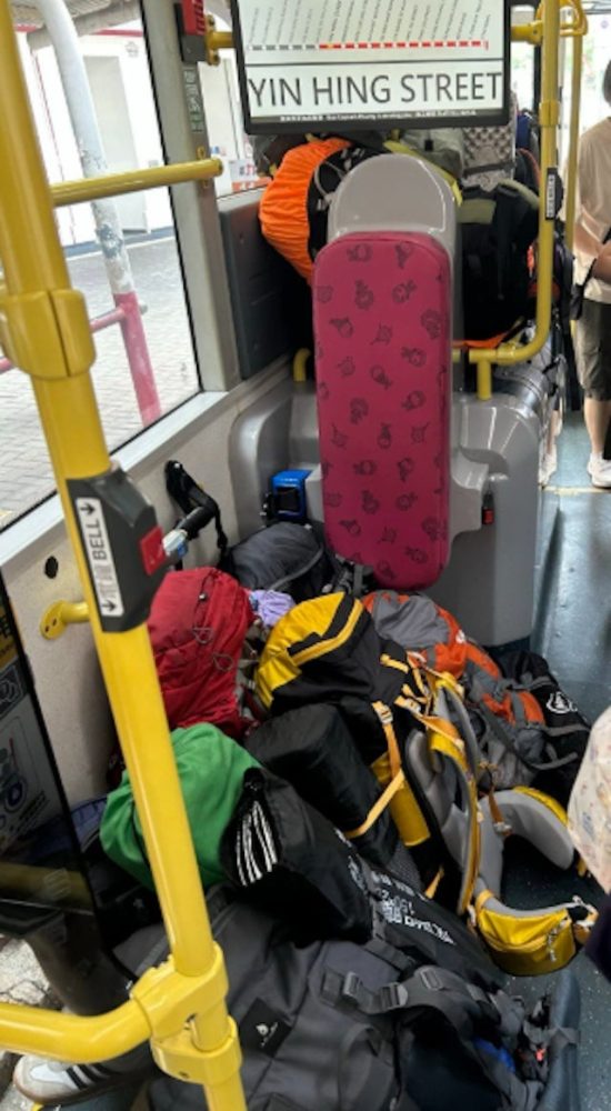 香港一名女网民日前在社交平台分享照片,指乘搭Kowloon Motor Bus(九巴)5号线时,发现有一批约十多人的乘客将大型背囊集中放置在车厢轮椅专区后,随即全部登上上层就座,引发争议。