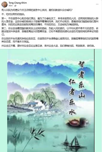 邓章钦也在贴文中引用“智者乐山、仁者乐水”,借此表达他对当前局势的看法与处事态度,并延伸说明应以理性方式处理政治分歧,而非将矛盾转移至服务中心外的示威行为。