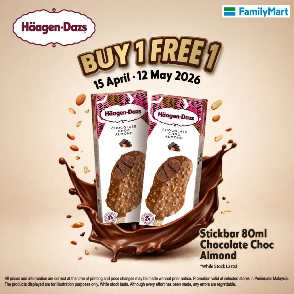 其次,FamilyMart也推出Häagen-Dazs Stickbar Chocolate Choc Almond冰淇淋买一送一活动,优惠期从4月15日持续至5月12日,适用于西马指定分行,两支售价为RM12.70。