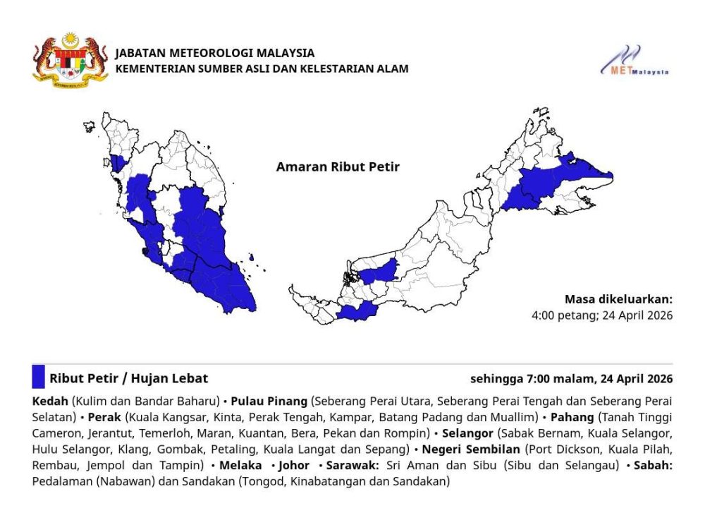 受影响州属包括吉打、槟城、霹雳、彭亨、雪兰莪、森美兰、马六甲及柔佛;砂拉越方面涉及斯里阿曼及诗巫部分地区,沙巴则包括内陆及山打根一带。相关恶劣天气预计持续至2026年4月24日晚上7时。