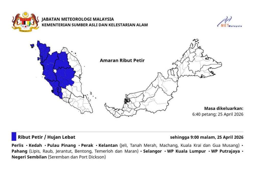 马来西亚气象局今日傍晚6时40分发布雷暴警告,预计以下地区将遭遇强雷暴、暴雨和强风天气,警告有效至今晚晚上9时