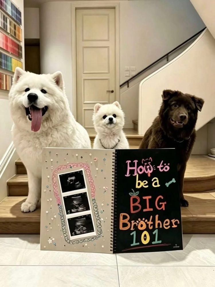 另一张照片中,家中三只宠物狗“升级”为未来哥哥,旁边摆放超声波照片及育儿相关道具,营造温馨又有趣的氛围,展现两人对新生命到来的期待。