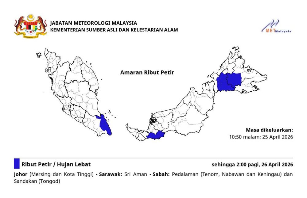 大马气象局于2026年4月25日晚上10时50分发布紧急气象预警,指国内多地正面临雷暴与强降雨袭击,预计恶劣天气将一直持续到明日(26日,周日)凌晨2时。