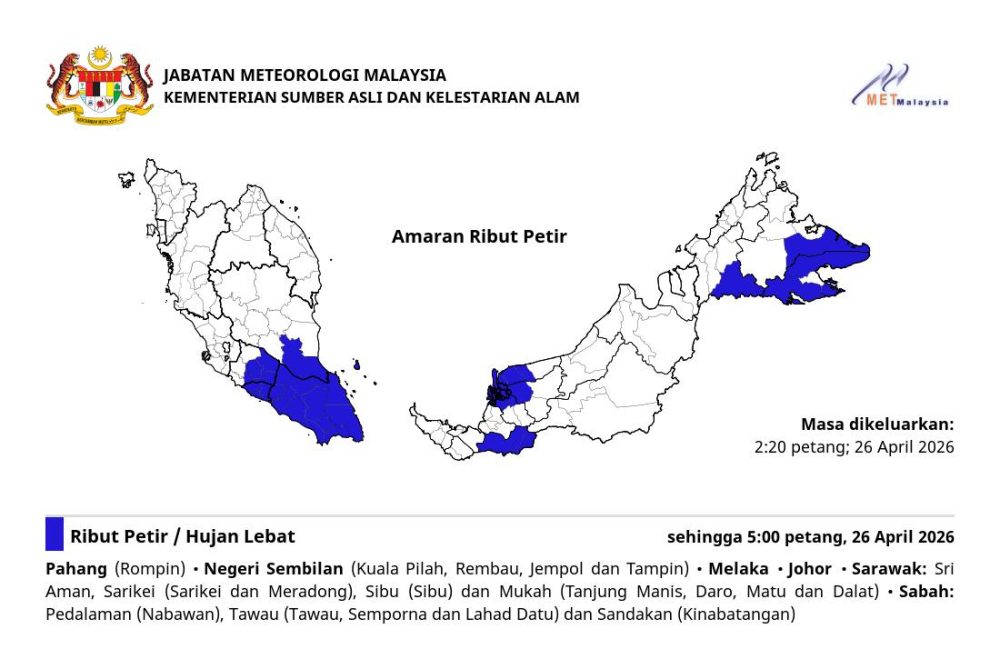 大马气象局(MET Malaysia)于今日(2026年4月26日)下午2时20分发布紧急雷雨预警。根据最新的气象监测,由于多地出现强降雨云团,预计雷暴、暴雨及强风天气将席卷半岛南部以及东马多个省份,恶劣天气预计将持续至今日下午5时。