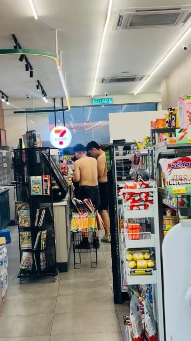 两名男子赤裸上半身进入便利商店购物的画面被顾客拍下,引发对公共礼仪的争议。有在场者直言,这样的举动有碍观瞻,并质问“真的有必要脱衣服吗?”