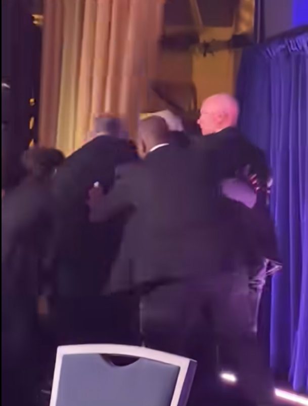 随后镜头转向美国总统唐纳德·特朗普,多名特工将其包围并协助护送撤离。过程中,特朗普疑似一度跌坐在地,但很快被扶起,在特勤人员护送下离开舞台,现场气氛紧张。