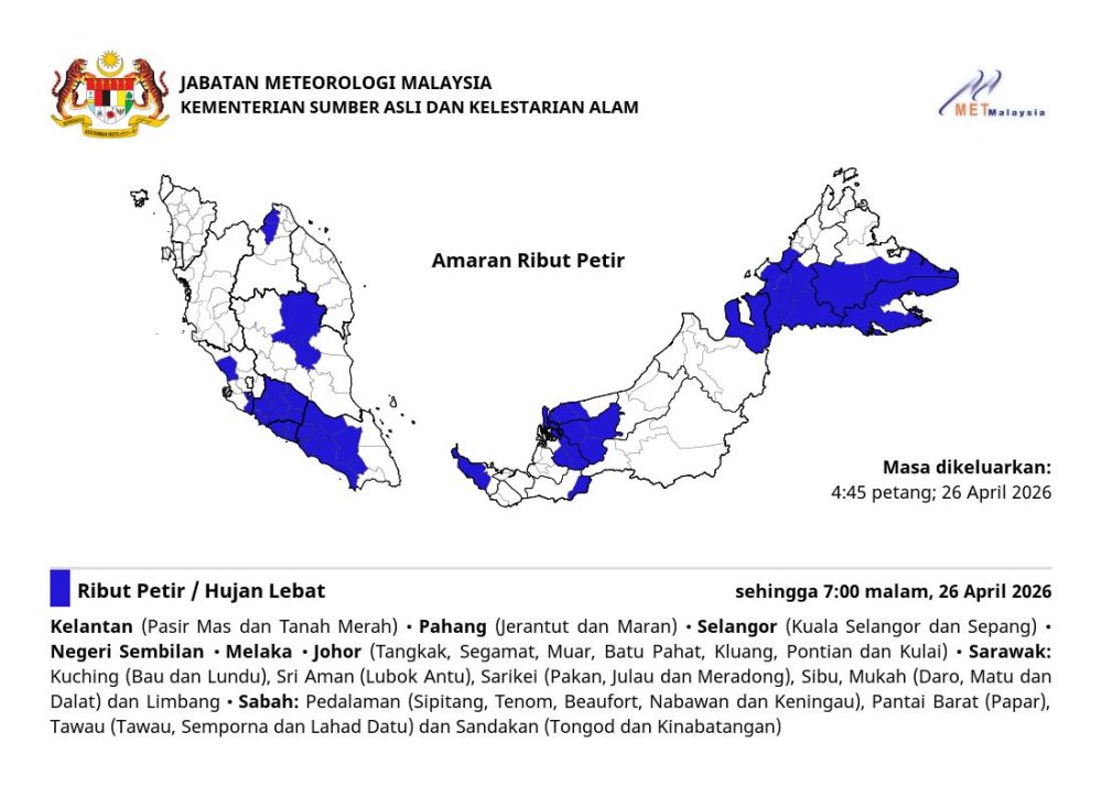大马气象局(MET Malaysia)于今日(26日,周日)下午4时45分发布最新黄色气象预警。根据雷达监测,全马多个州属正面临强对流天气袭击,预计雷暴、大雨及强风将持续至今日傍晚7时。