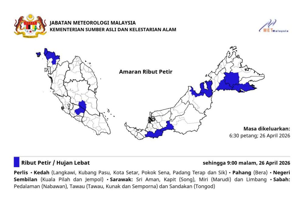 大马气象局(MET Malaysia)于今日(26日)傍晚6时30分发布最新一波黄色预警,指全国多个地区预计将出现雷暴、强降雨及强风天气,影响范围涵盖北马、东海岸及东马部分地区,天气状况可能持续至今晚9时。
