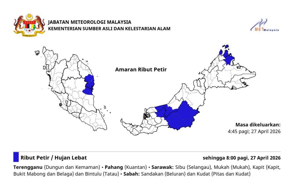根据气象局于4月27日清晨4时45分发布的警报,受影响地区包括登嘉楼、彭亨、砂拉越及沙巴部分地区。