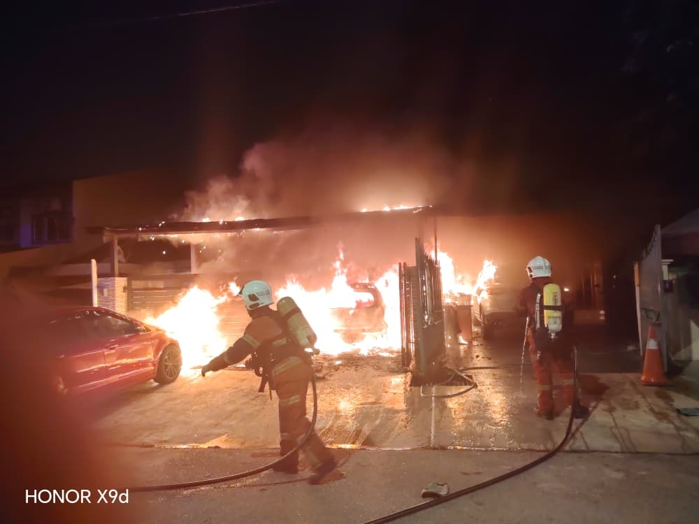 雪州八打灵再也一处排屋区昨晚发生火患,两间相邻排屋受波及,停放在屋外的3辆轿车及1辆摩哆也被烧毁,所幸事故没有造成人命伤亡。