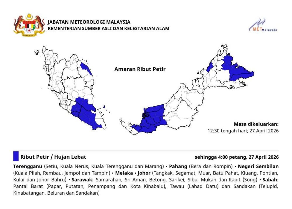根据通告,相关天气警告于2026年4月27日中午12时30分发出,预计将持续至当天下午4时。受影响地区涵盖多个州属,包括登嘉楼、彭亨、森美兰、马六甲及柔佛部分地区。
