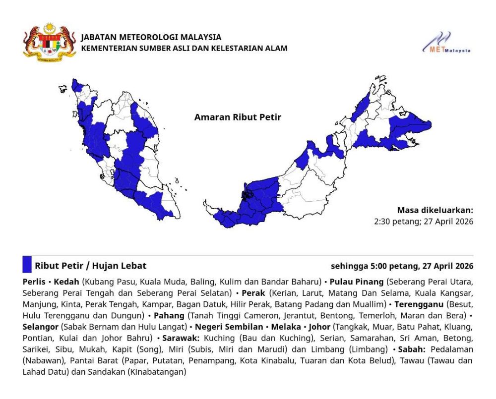 受影响地区范围广泛,包括玻璃市、吉打、槟城、霹雳、登嘉楼及彭亨多个县区;巴生谷一带如雪兰莪及森美兰部分地区同样列入警戒范围,南部的马六甲与柔佛也将出现类似天气。