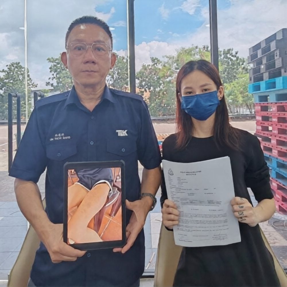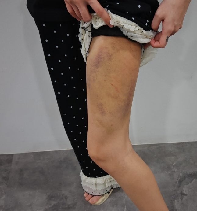 事主彭家欣(招待员)今日通过邓烈康团队柔佛州投诉主任林道祥召开新闻发布会。她透露,本月24日清晨6时左右,男友针对前男友一事与她发生口角,随后操起藤条猛力抽打她,一边骂一边打,过程持续半小时之久,导致左大腿布满鞭痕及大面积瘀青。