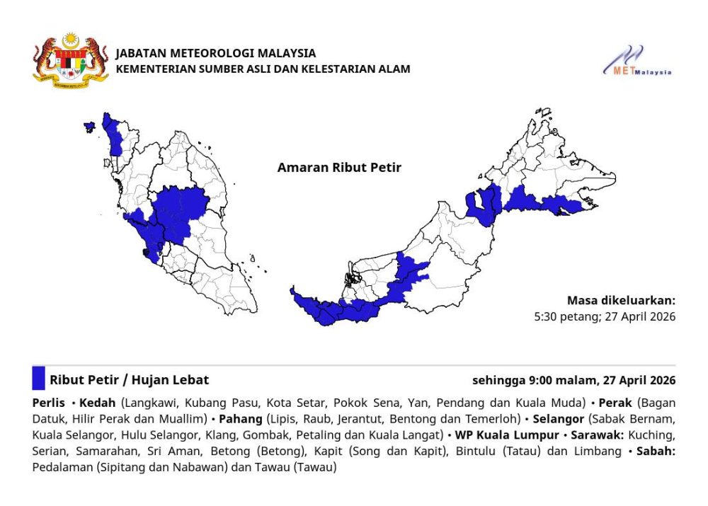 马来西亚气象局(MET Malaysia)于今日傍晚5时30分发布最新雷雨预警。根据卫星云图显示,我国多地雷雨带持续活跃,相关地区的强降雨、雷暴及强风天气预计将延长至今日(27日)晚上9时。